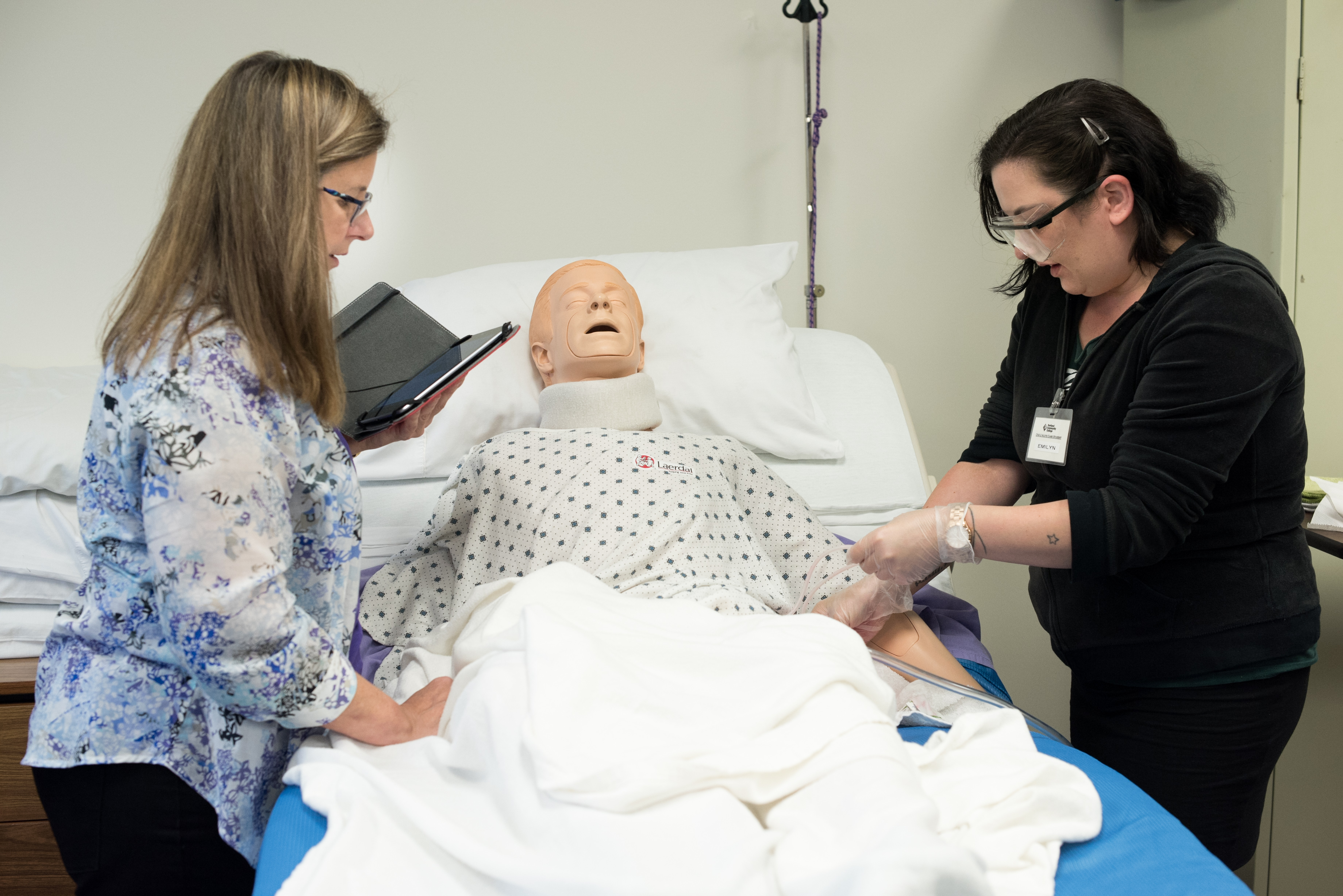 Young man practices emergency medicine and critical care techniques with life size medical dummy in ambulance training