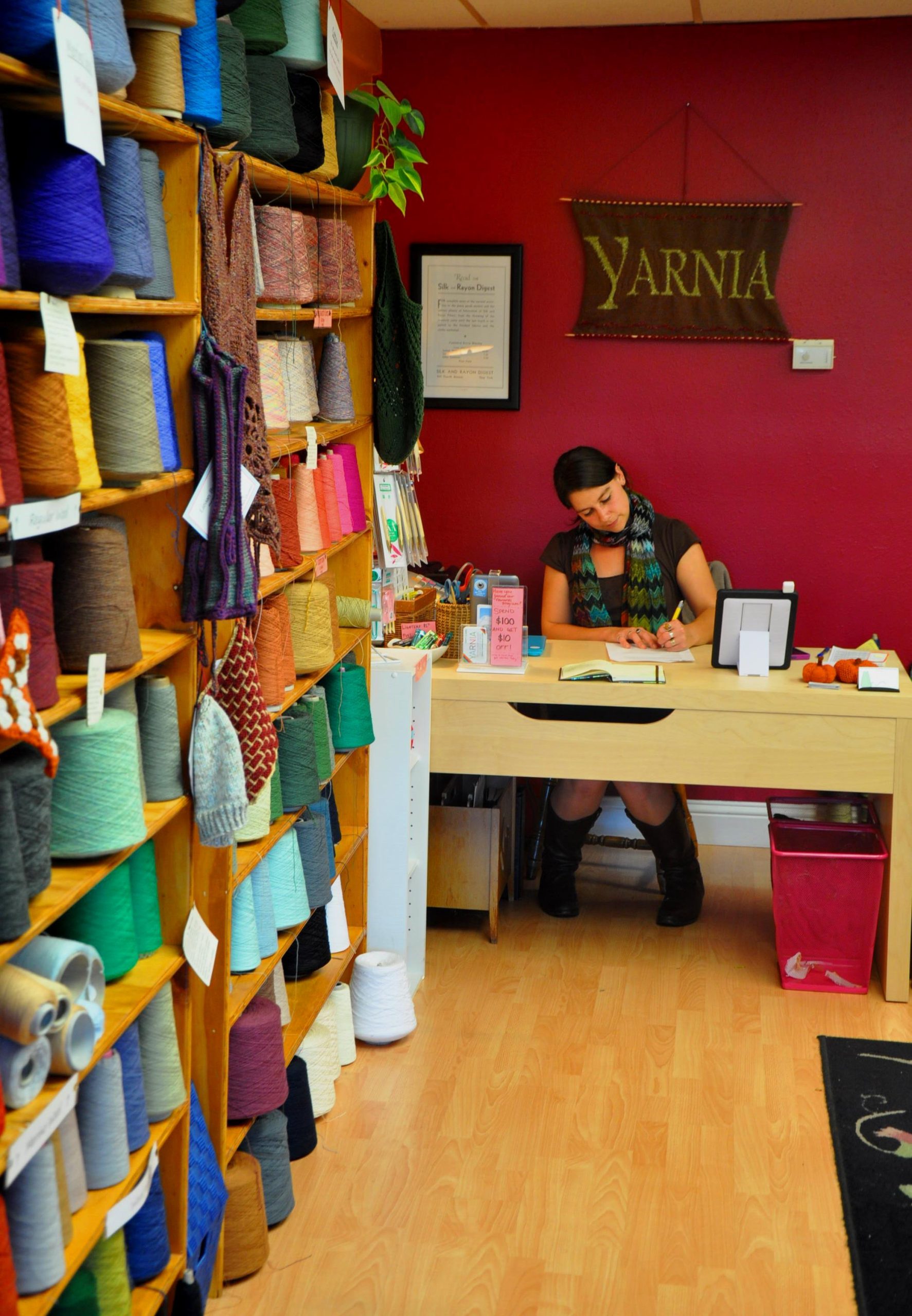 yarniaYarnia is Portland’s only DIY yarn store. It’s tucked away underneath some plaza stairs on SE Division and 41st in Portland. When you walk inside you’re surrounded by brilliant colors of coned yarn stacked to the ceiling. There is a cozy nook with comfy chairs just yearning to be sat in to knit something. And there is a modern, antique looking machine that fills the room with a humming sound as it makes custom yarn.