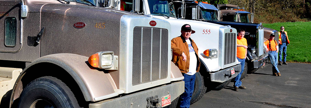 Small Business Builders graduate Bud Construction stands in front of semi trucks.
