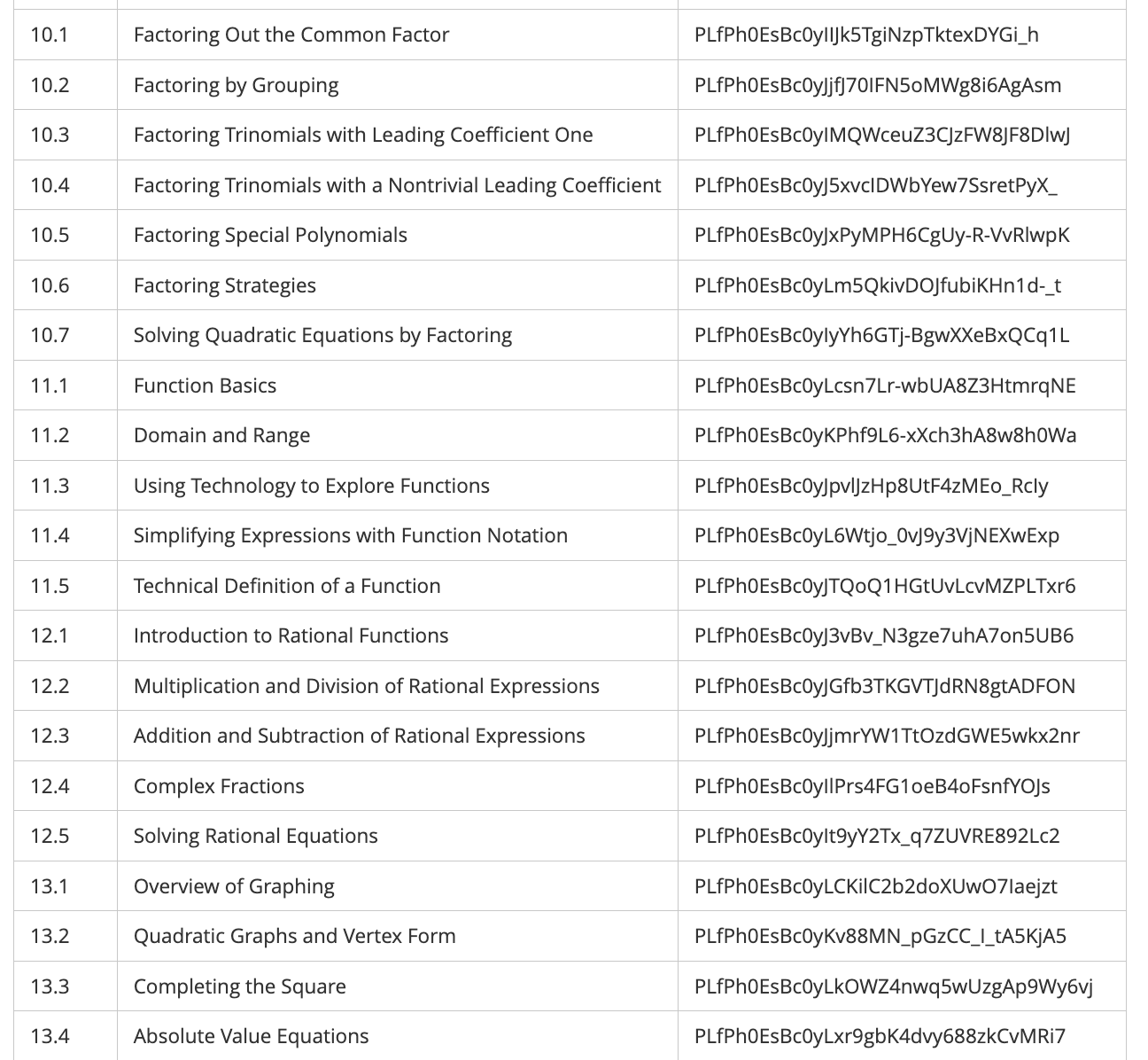 You will see a full list of links to online videos for Math 95 and the Playlist ID is located to the far right.
