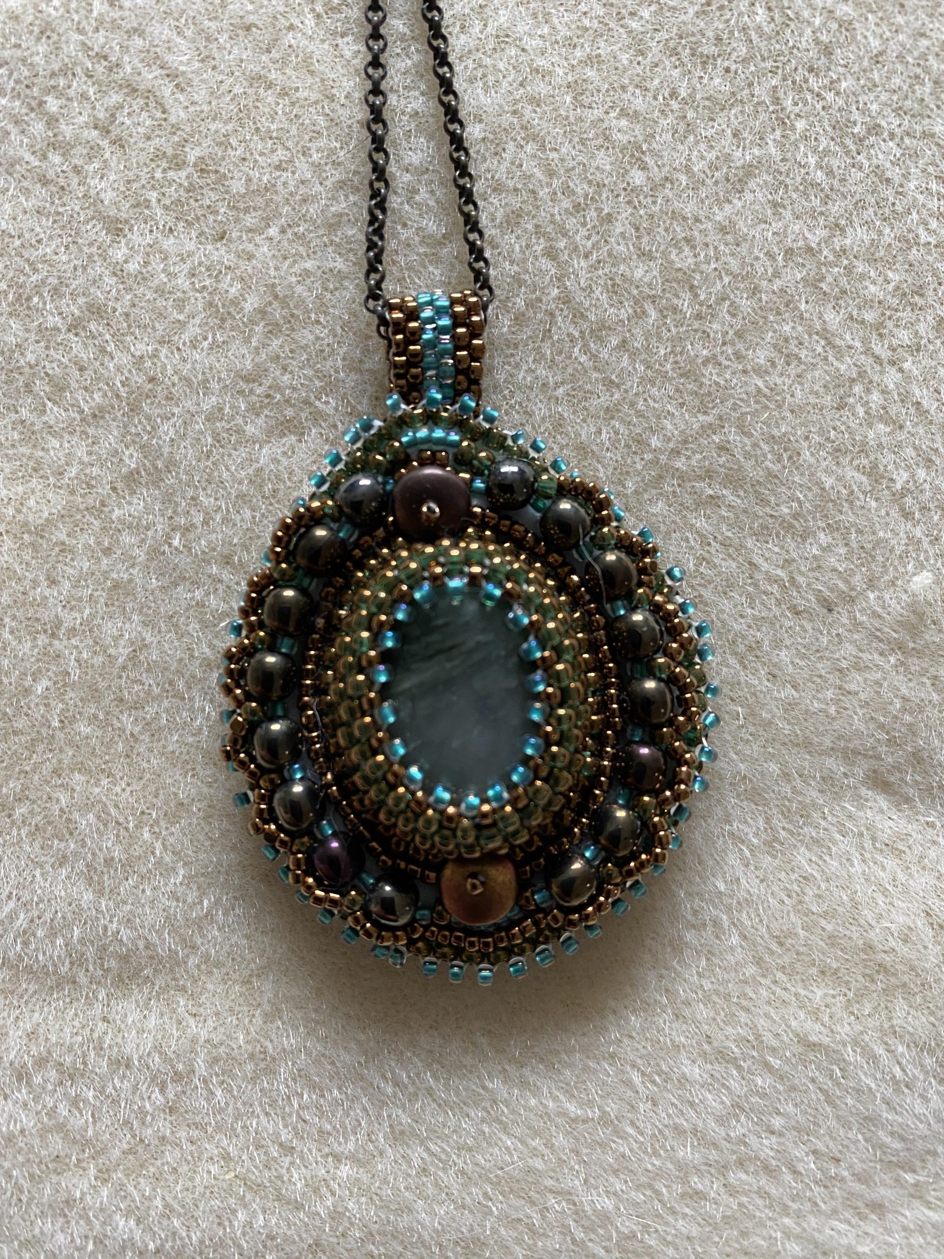 Beaded Pendants — Peyote Stitch: encase a piece of polished glass in seed beads, create a loop, and finish your piece with a chain and clasp.
