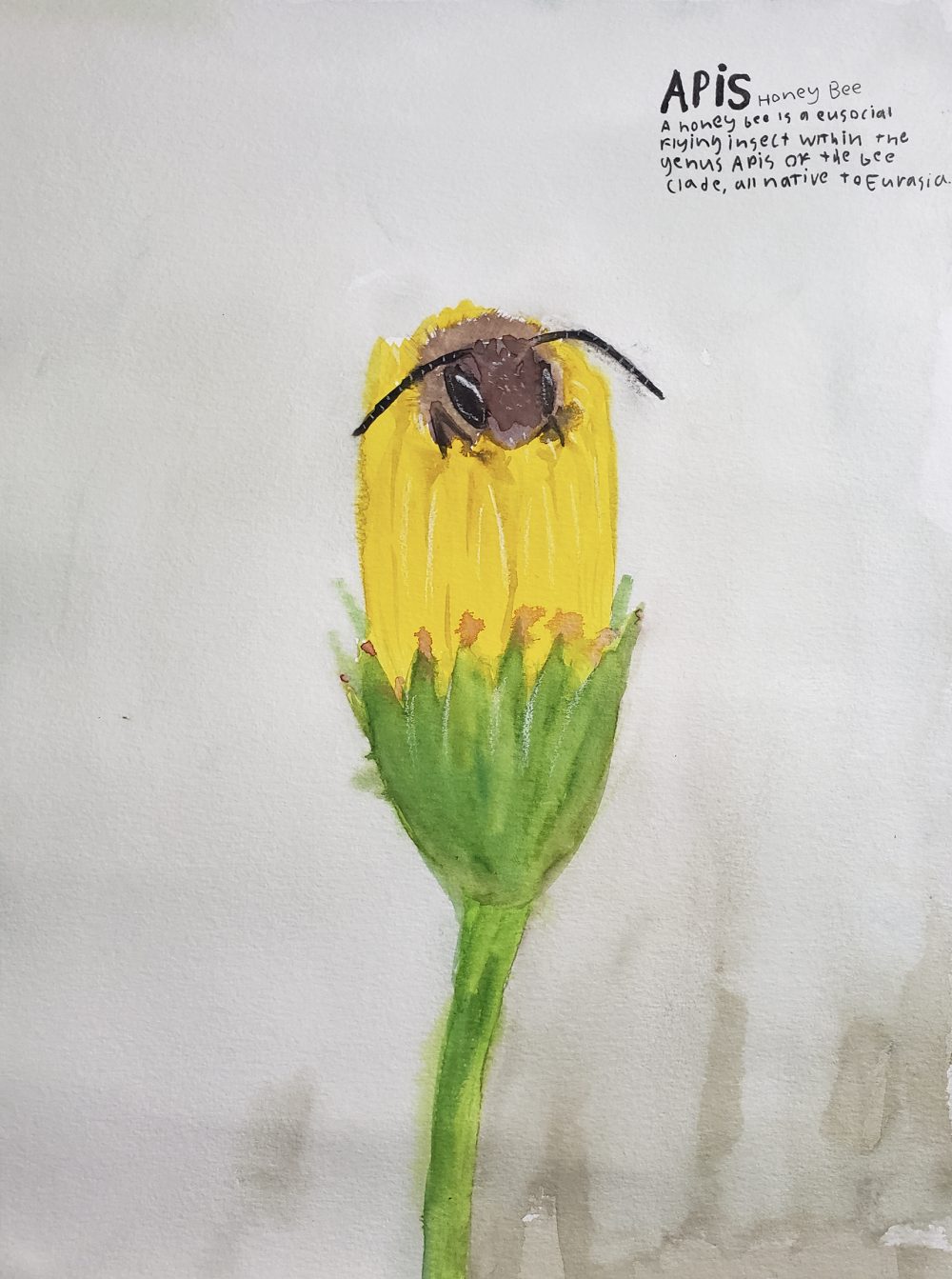 The honey bee is a eusocial flying insect within the genus Apis of the bee clade, all native to Eurasia. They are known for their construction of perennial colonial nests from wax, the large size of their colonies, and surplus production and storage of honey, distinguishing their hives as a prized foraging target of many animals, including honey badgers, bears, and human hunter-gatherers.