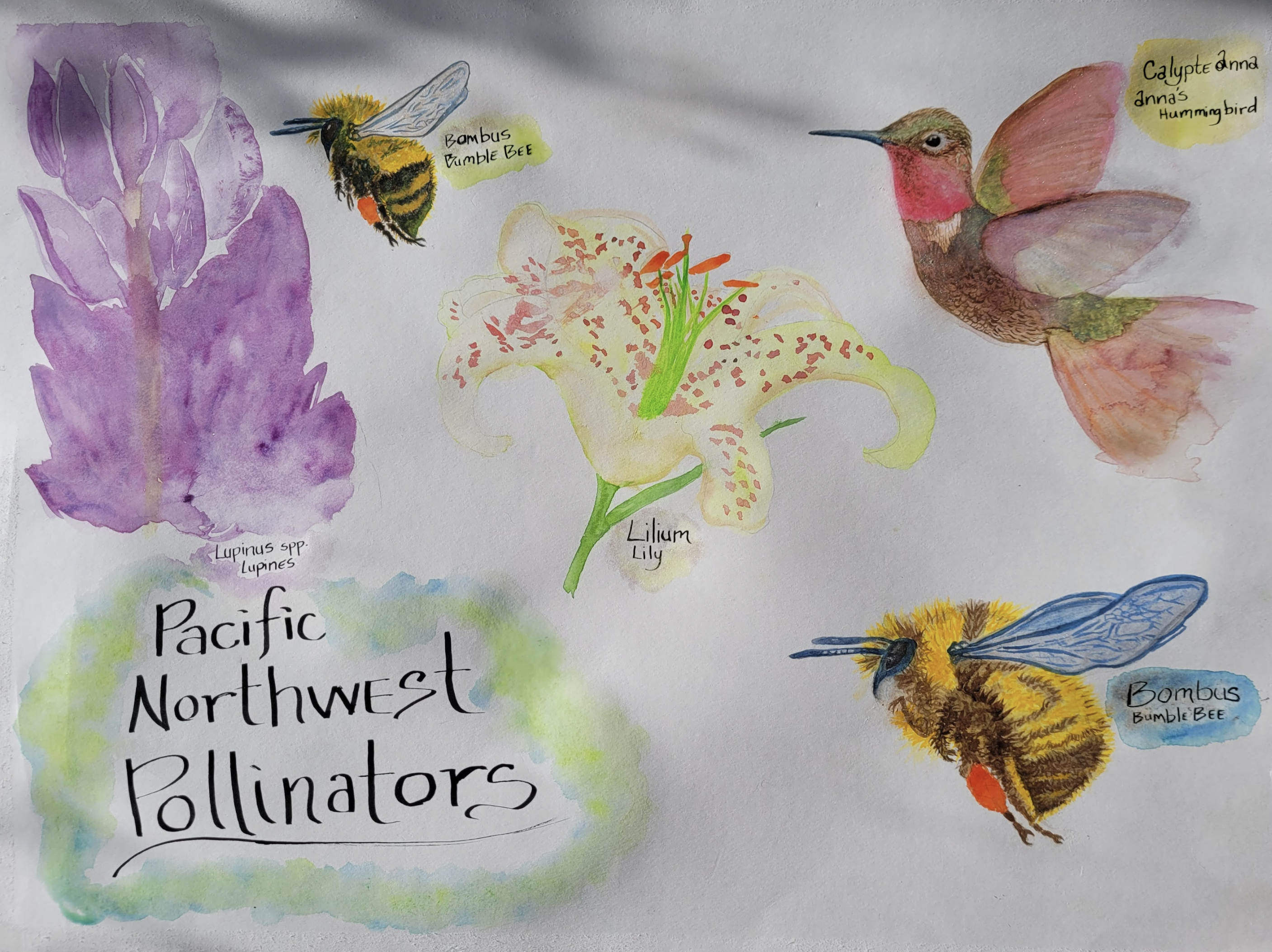 Bombus- A bumblebee is any of over 250 species in the genus Bombus, part of Apidae, one of the bee families. This genus is the only extant group in the tribe Bombini, though a few extinct related genera (e.g., Calyptapis) are known from fossils. They are found primarily in higher altitudes or latitudes in the Northern Hemisphere, although they are also found in South America, where a few low land tropical species have been identified. European bumblebees have also been introduced to New Zealand and Tasmania. Female bumblebees can sting repeatedly, but generally ignore humans and other animals. Calypte Anna- Anna's hummingbird (Calypte anna) is a medium-sized bird species of the family Trochilidae. It was named after Anna Masséna, Duchess of Rivoli. It is native to western coastal regions of North America. In the early 20th century, Anna's hummingbirds bred only in northern Baja California and southern California. The transplanting of exotic ornamental plants in residential areas throughout the Pacific coast and inland deserts provided expanded nectar and nesting sites, allowing the species to expand its breeding range. Year-round residence of Anna's hummingbirds in the Pacific Northwest is an example of ecological release dependent on acclimation to colder winter temperatures, introduced plants, and human provision of nectar feeders during winter. Lilium Flower- Lilium is a genus of herbaceous flowering plants growing from bulbs, all with large prominent flowers. They are the true lilies. Lilies are a group of flowering plants which are important in culture and literature in much of the world. Most species are native to the northern hemisphere and their range is temperate climates and extends into the subtropics. Many other plants have "lily" in their common names, but do not belong to the same genus and are therefore not true lilies. Lupinus Spp.- Lupinus, commonly known as lupin, lupine, or regionally bluebonnet etc., is a genus of flowering plants in the legume family Fabaceae. The genus includes over 199 species, with centers of diversity in North and South America. Smaller centers occur in North Africa and the Mediterranean. They are widely cultivated, both as a food source and as ornamental plants, although in the Nordic countries and New Zealand's South Island, introduced lupins are viewed as a severe environmental threat.