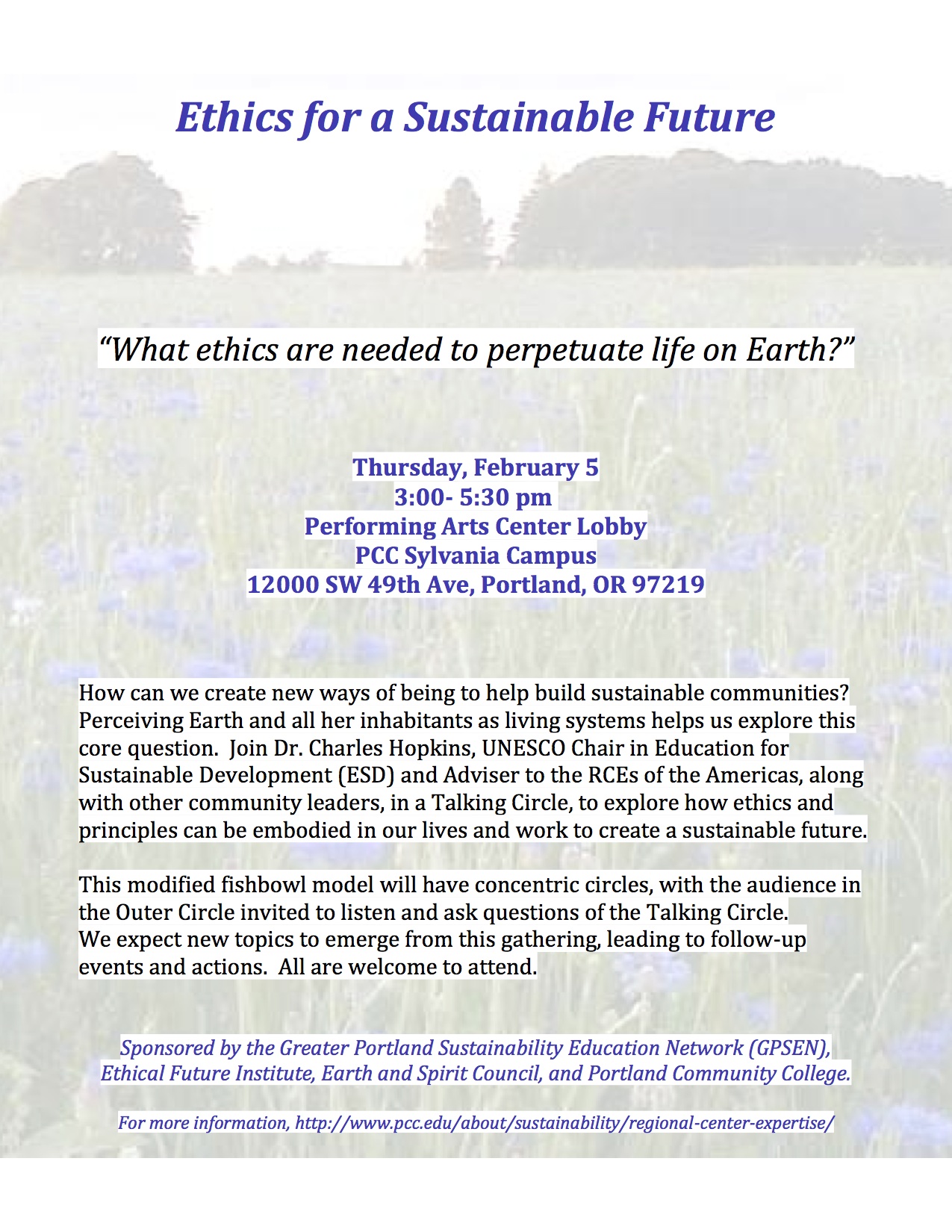 Sponsored by the Greater Portland Sustainability Education Network (GPSEN), Ethical Future Institute, Earth and Spirit Council, and Portland Community College.