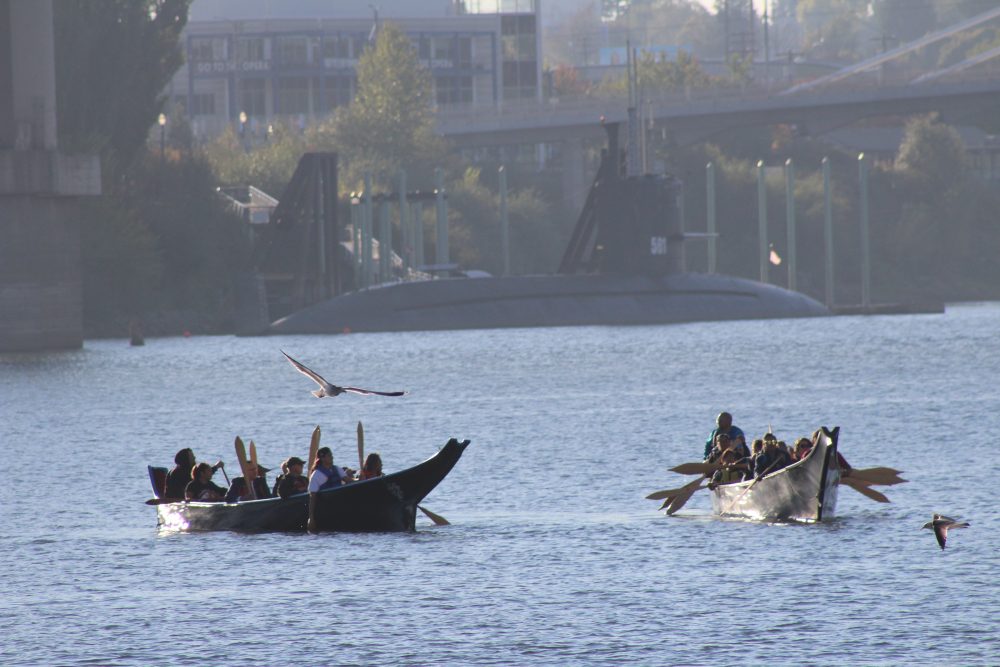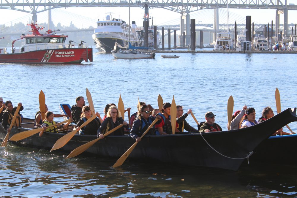 The Canoes approach on the Willamette. On board is mayor Ted Wheeler and City Commissioner Chloe Eudaly along with members of the local tribes of this area.