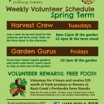1 - Rock Creek Learning Garden Weekly Volunteer Schedule Spring Term Harvest Crew: Tuesdays Join a team to harvest food for the […] Posted March 18, 2015