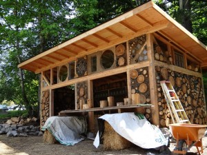 Along with an extensive water catchment system, volunteers used different building techniques, including straw clay, cob, and cord wood construction, to create a beautiful, sustainable structure that houses the vermiculture bins.