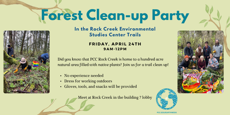 Did you know that PCC Rock Creek is home to a hundred acre natural area filled with native plants? We also have a ~1 mile trail system that leads through the forest. Some introduced plants can have a negative effect on the local biodiversity, so we will spend our time together clearing the trails and removing invasive plants, such as blackberry, and shiny geranium. No experience needed, but please dress for working outdoors by wearing long pants, long sleeves, and closed toe shoes with good traction. Gloves, tools, and snacks will be provided! Please bring your own water.