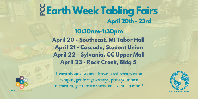 Participate virtually all month long with the EcoChallenge! This year’s Earth Month Ecochallenge theme is “Conserving Every Ecosystem, Caring for Every Creature” and runs from April 1st to April 30th. You’re invited to select actions that resonate with your values, committing to them for 30 days to foster and reinforce positive habits. Each action you complete earns points and generates real-world impact. Your efforts, combined with those of your team, contribute to a significant collective difference. Sign up for the EcoChallenge and if you have any questions, email kdsmith@pcc.edu.